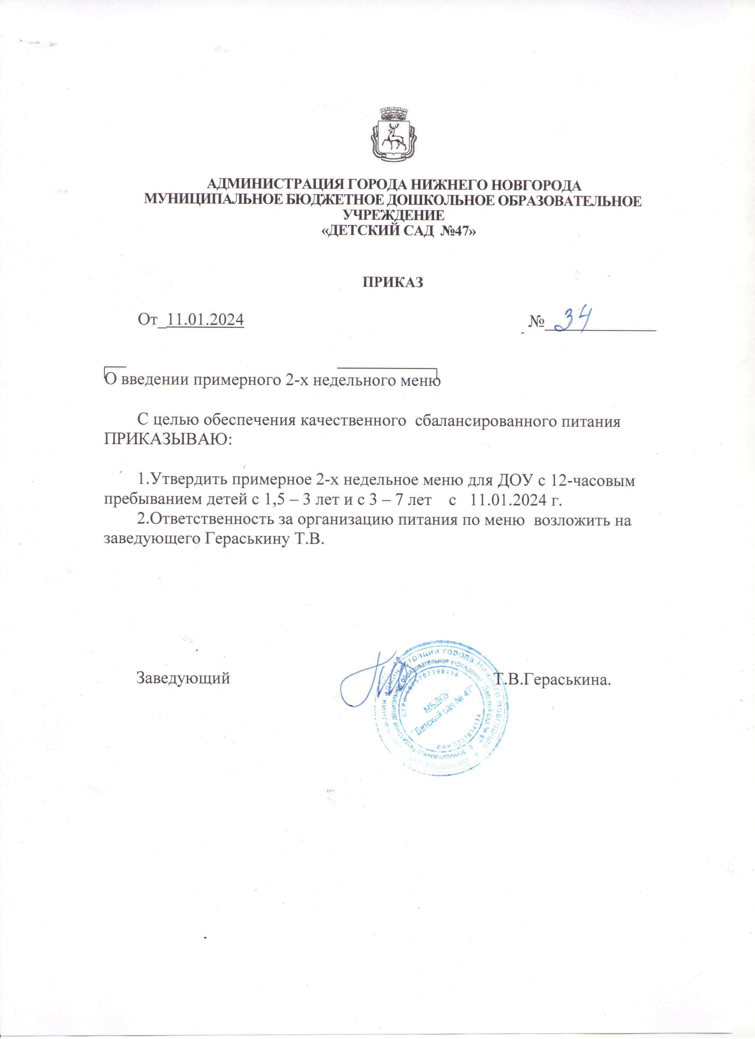 Учреждение обеспечивает воспитанников (в том числе и инвалидов и лиц с ограниченными возможностями здоровья) полноценным сбалансированным питанием. В детском саду организовано 4-х разовое питание (завтрак, второй завтрак, обед, уплотненный полдник), в соответствии с 10-дневным меню, утвержденным Департаментом образования администрации города Нижнего Новгорода. Меню разработано с учетом физиологических потребностей в энергии и пищевых веществах для детей всех возрастных групп и рекомендуемых суточных наборов продуктов для организации питания в ДОУ. Приготовление блюд осуществляется в соответствии с технологическими картами, в которых отражена рецептура и технология приготавливаемых блюд и кулинарных изделий.